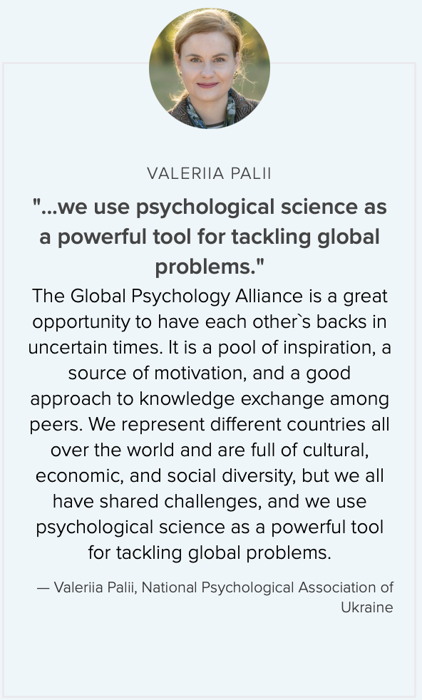 The Global Psychology Alliance (“Alliance”) is comprised of more than 70 national, regional, and international psychological organizations from every region of the world committed to jointly and actively addressing global issues through elevating psychological science to enhance human well-being. Leaders from Alliance member associations recognize that global challenges require collaborative, global responses, and understand that bringing together diverse experiences, knowledge, and perspectives strengthens our collective impact.